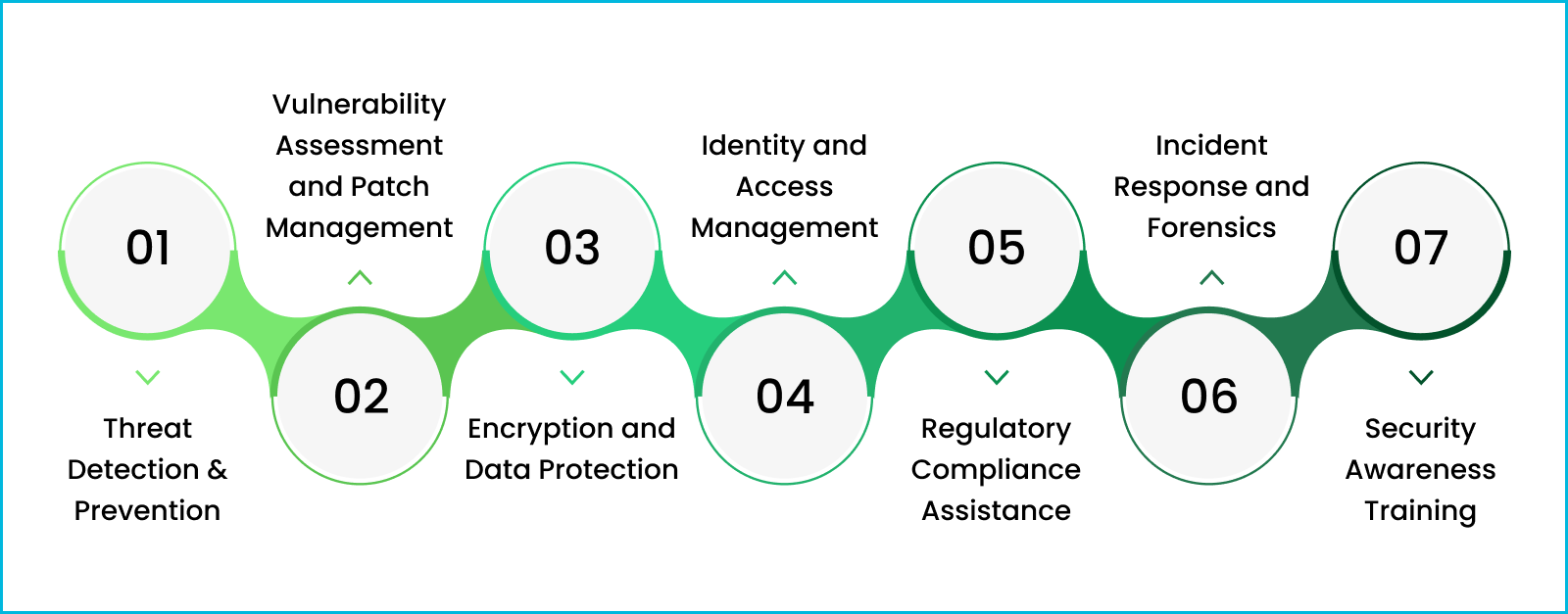 4.) Compliance and Auditing: Ensuring compliance with regulatory frameworks such as GDPR, PCI DSS, and ISO 27001 through regular audits and assessments.
